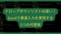 実務の深淵ドロップダウンリストは遅い!Excelで爆速入力を実現する2つの代替案 はじめに:ドロップダウンリストって、本当に便利ですか?Excelでデータを入力してもらう際、「ドロップダウンリスト(データの入力規則)」を設定するのは定番ですよね。特に「大分類」を選んだら、それに対応した「中分類」が出てきて、さらに「小分類... 2026.02.19実務の深淵
