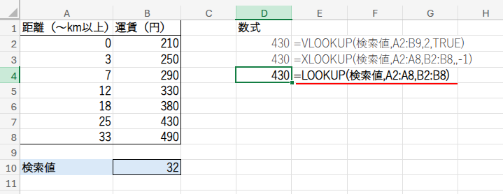 「33」は32を超えてしまった、NG!じゃあ、一つ手前の「25」の行が正解だな!と判断し、その行の2列目にある「430」を返してくれるのです。