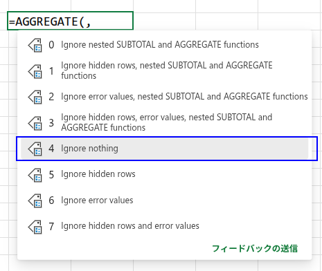 AGGREGATE関数は、SUBTOTALをさらに強化したような関数。第1引数の「9」は同じく「合計」。