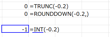 - INT関数: 「-1」になります。(より小さい値に向かって切り捨てる)
